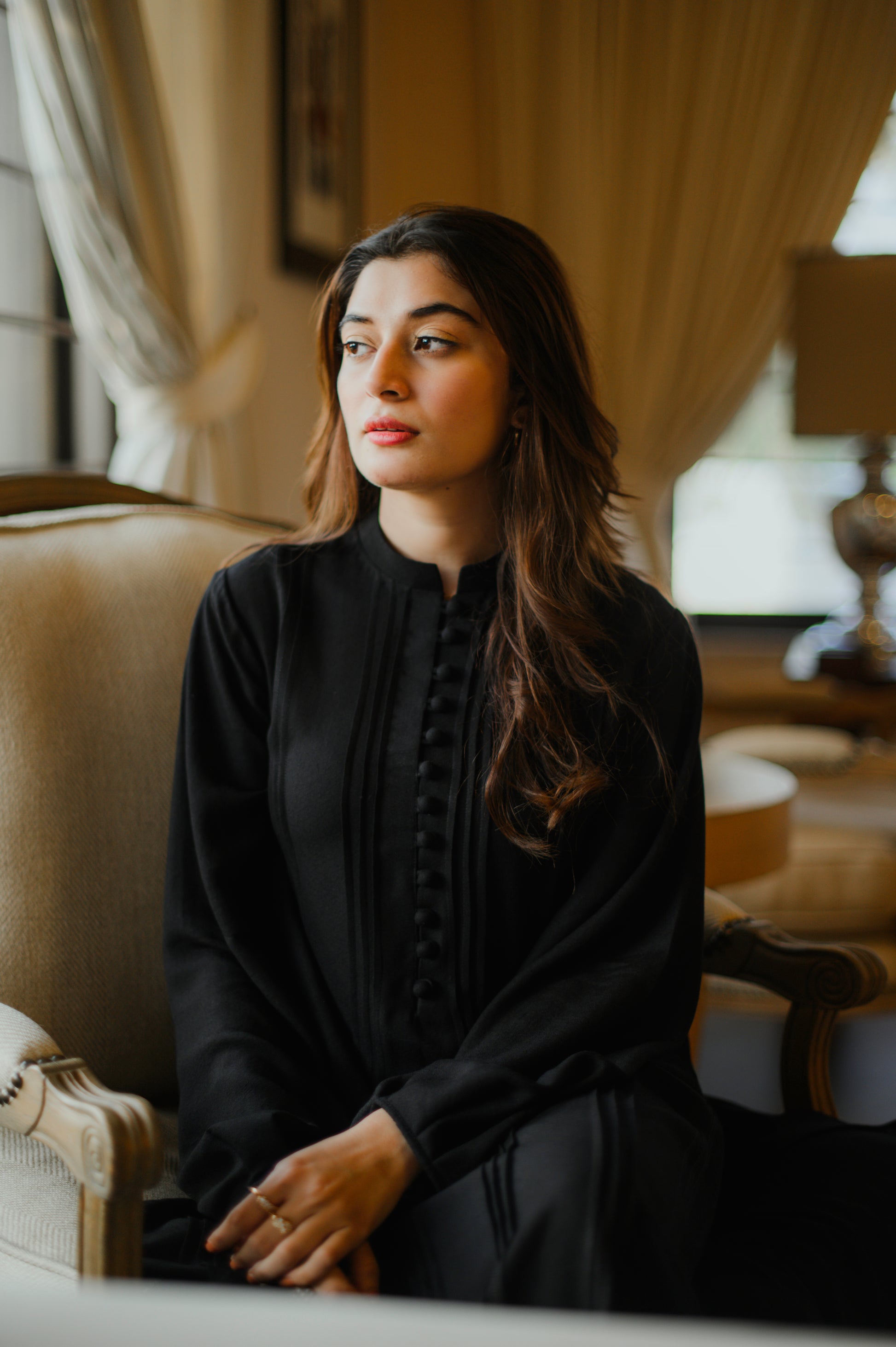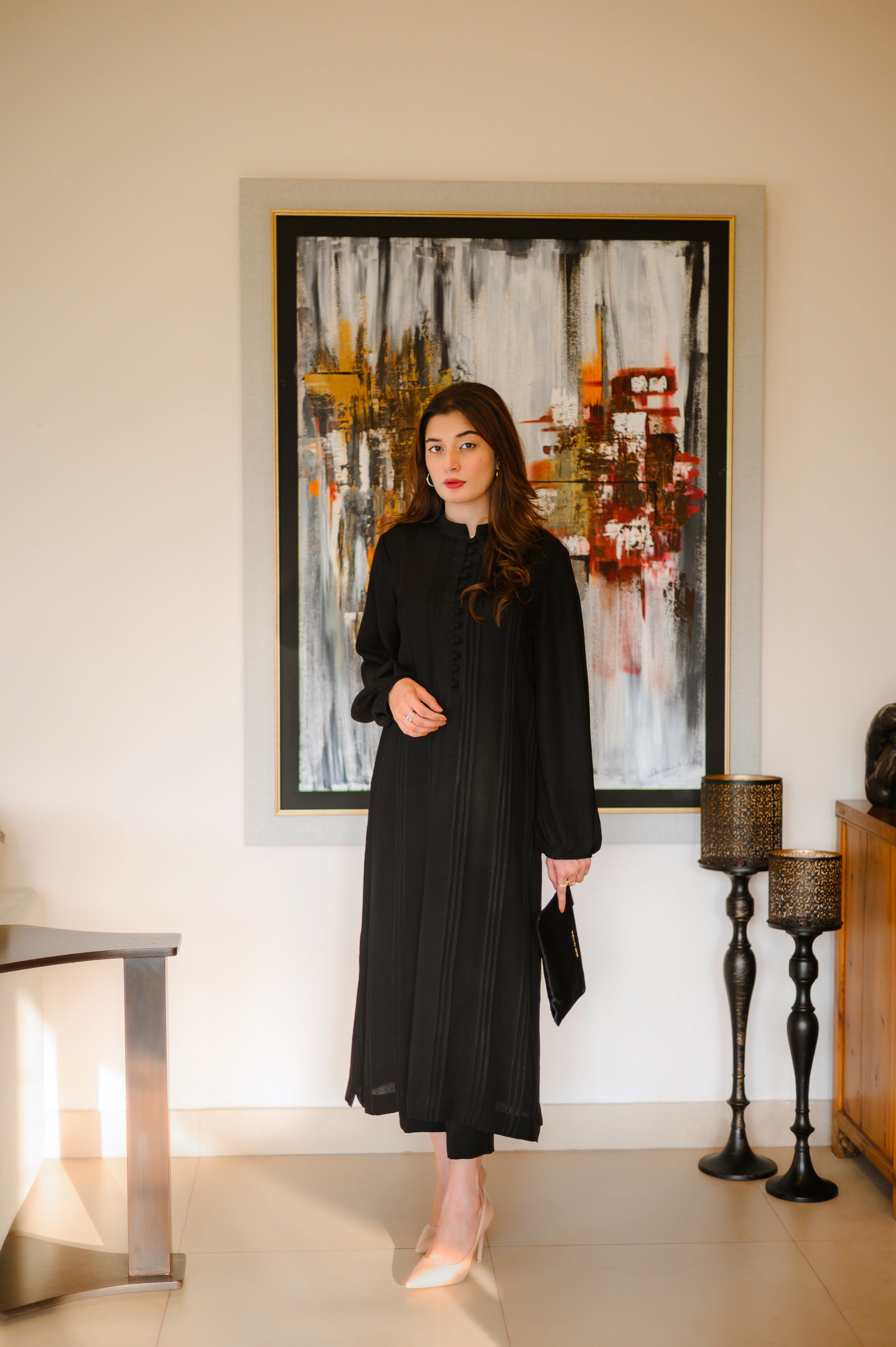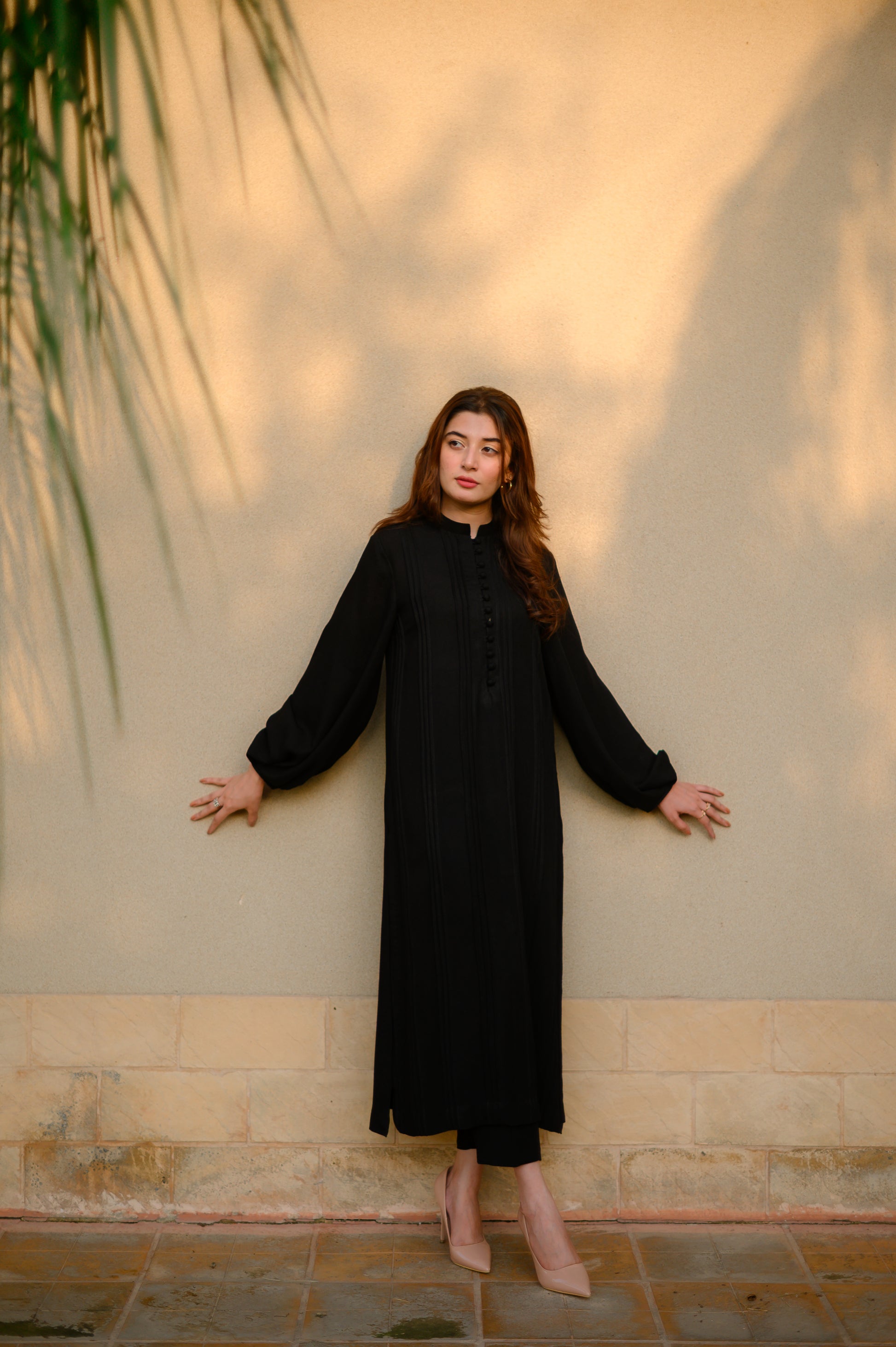 5 - 7 daysAnkle-length shirt stitched to detail with in line pleats & hanging sleeves. It’s paired with slim fit pants.