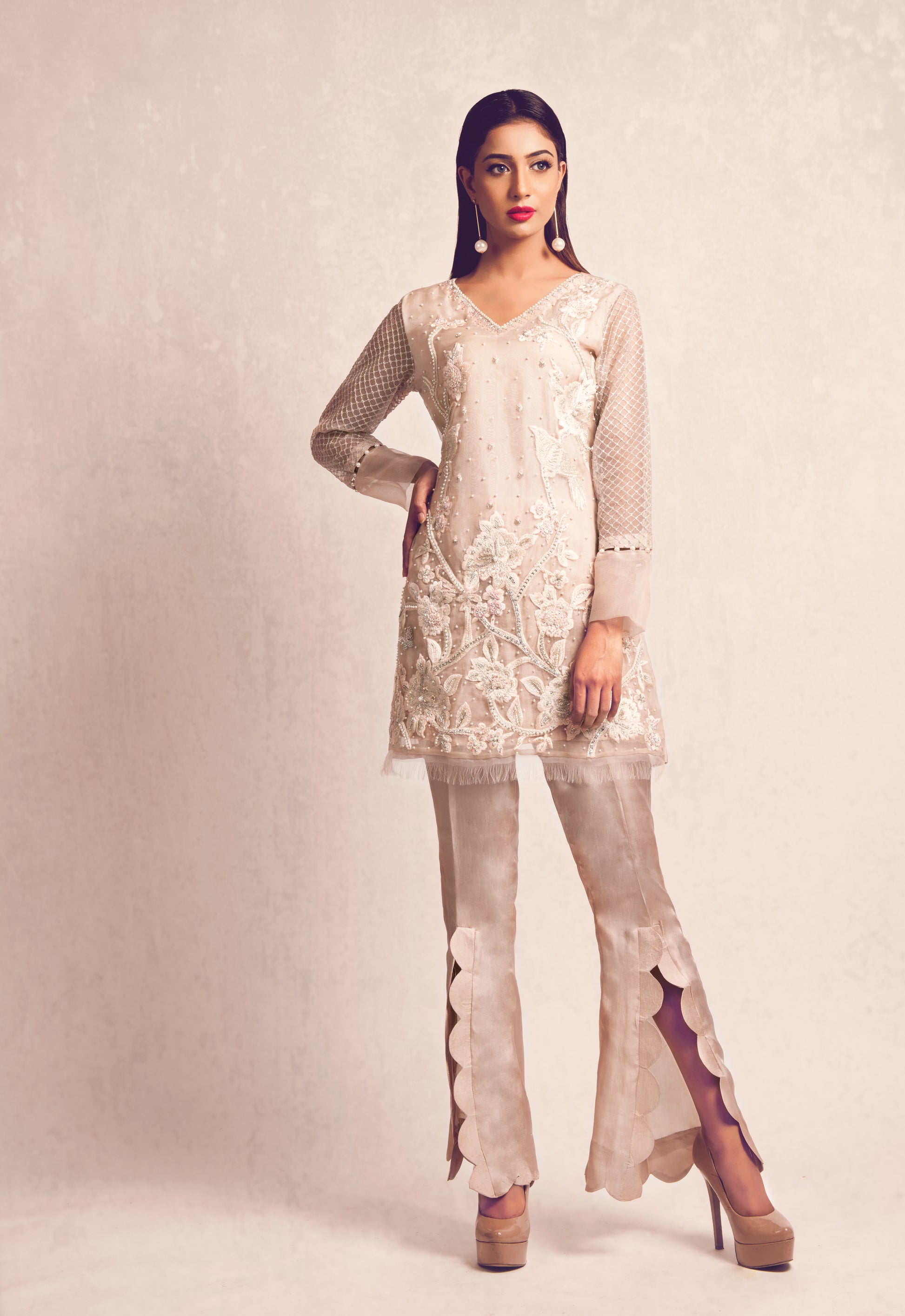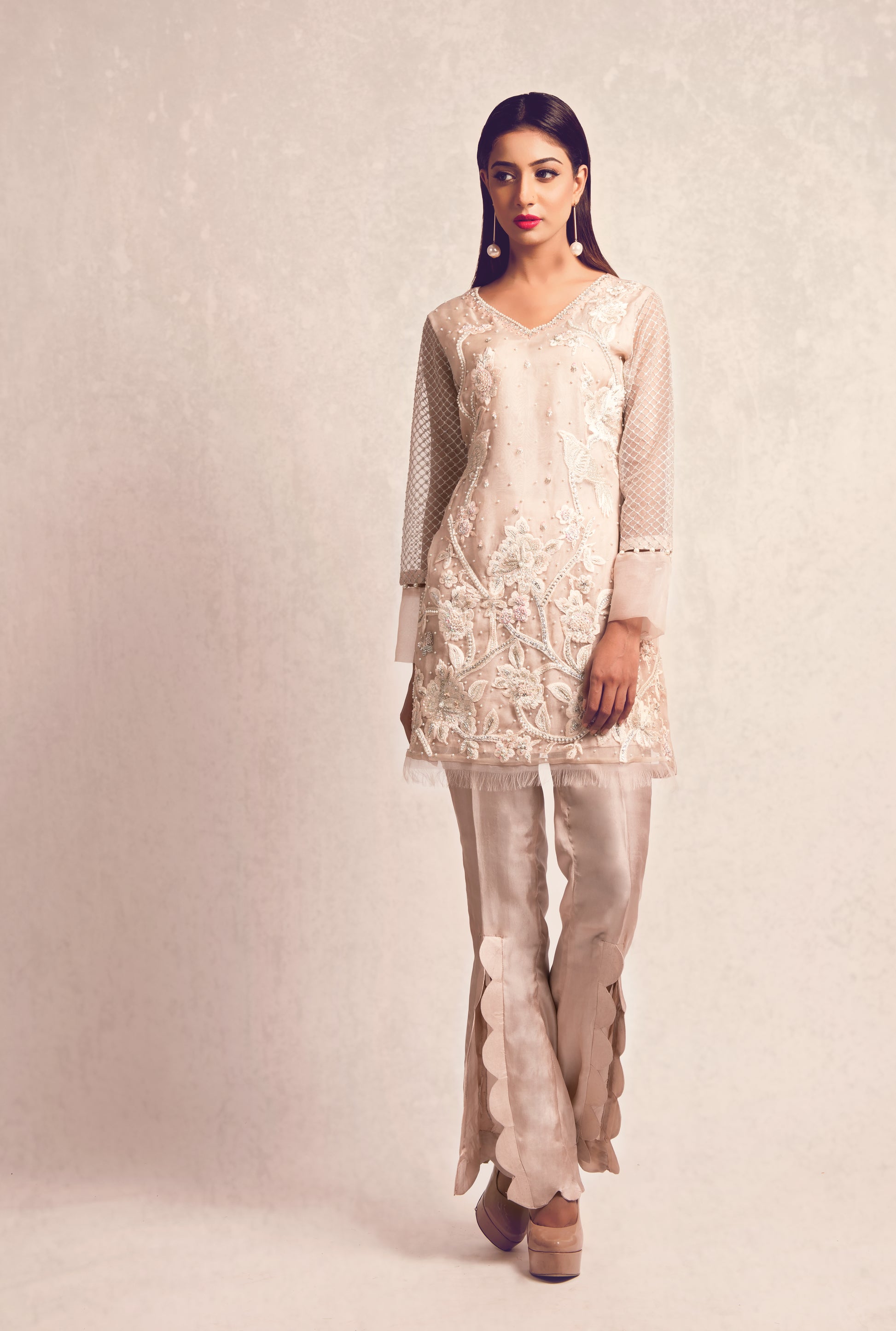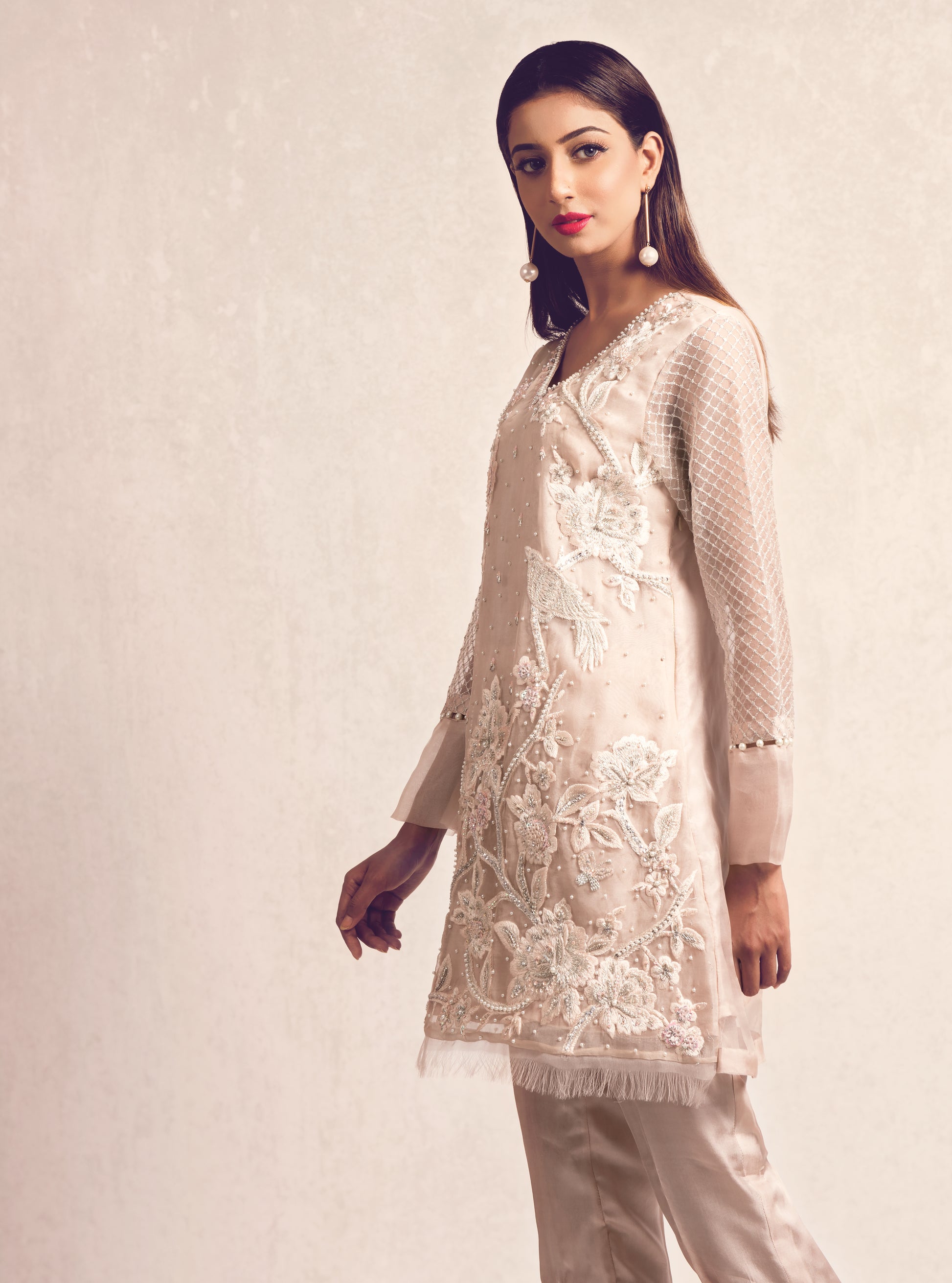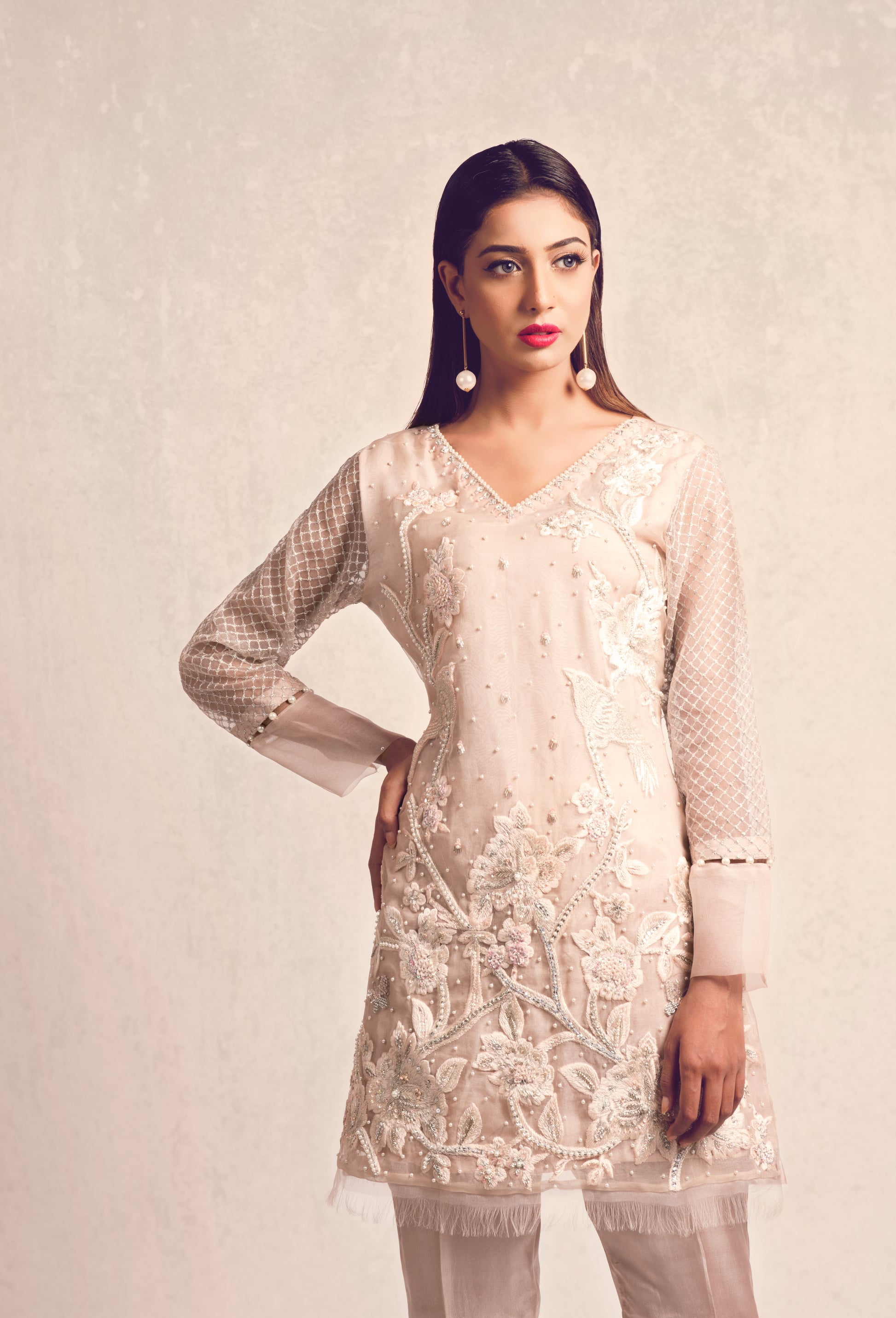 3-4 weeksAn ethereal shift dress crafted on pure organza, adorned with intricate thread embroidery showcasing delicate birds and floral motifs. Enhanced with exquisite handwork, this timeless piece exudes elegance. Paired with silk bell-bottoms featuring subtle slit details for a graceful, modern silhouette.