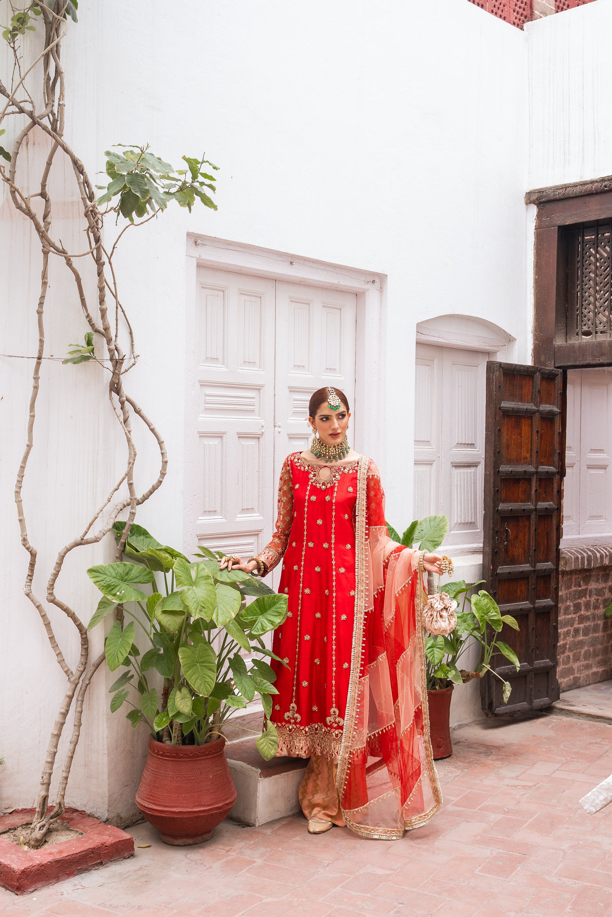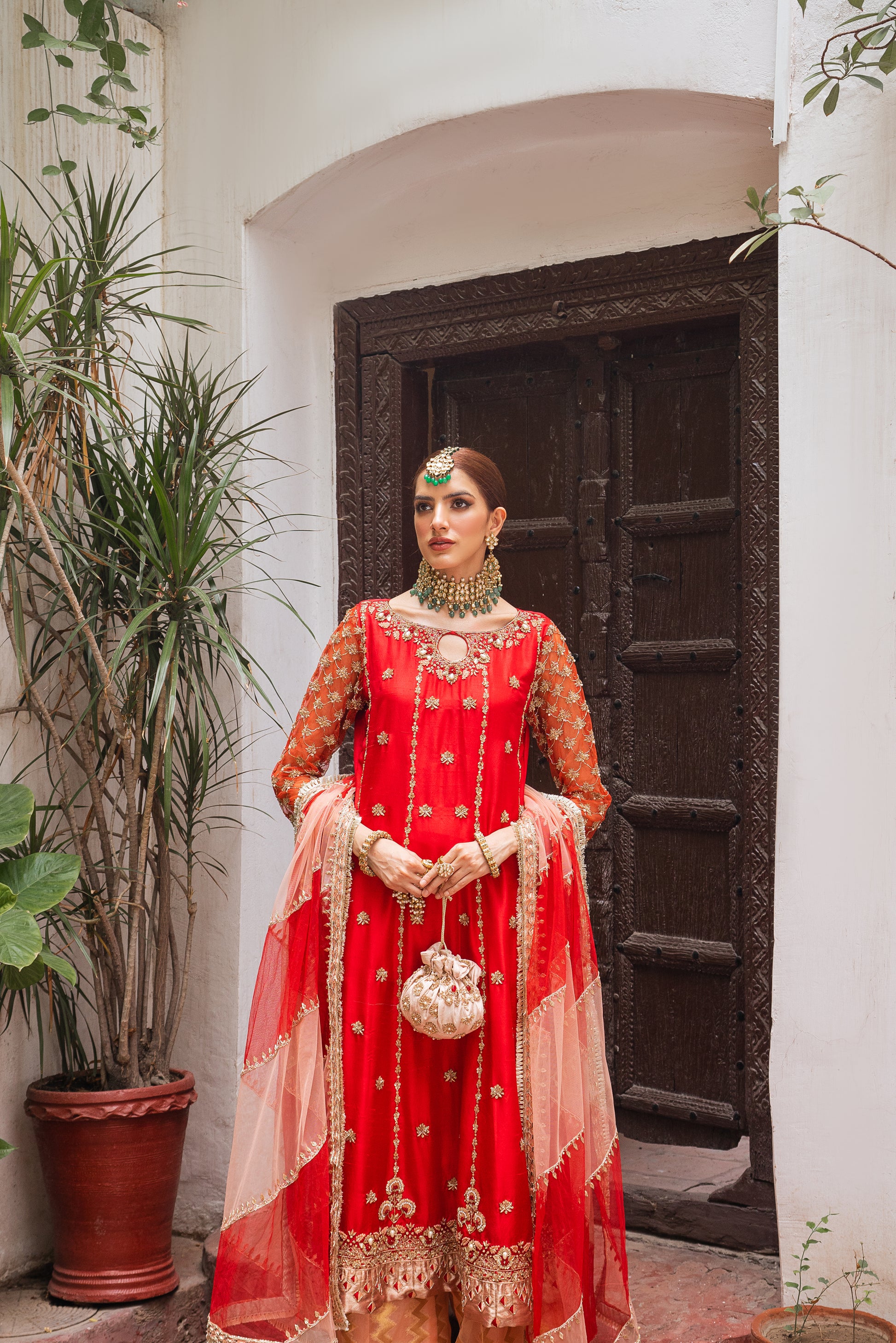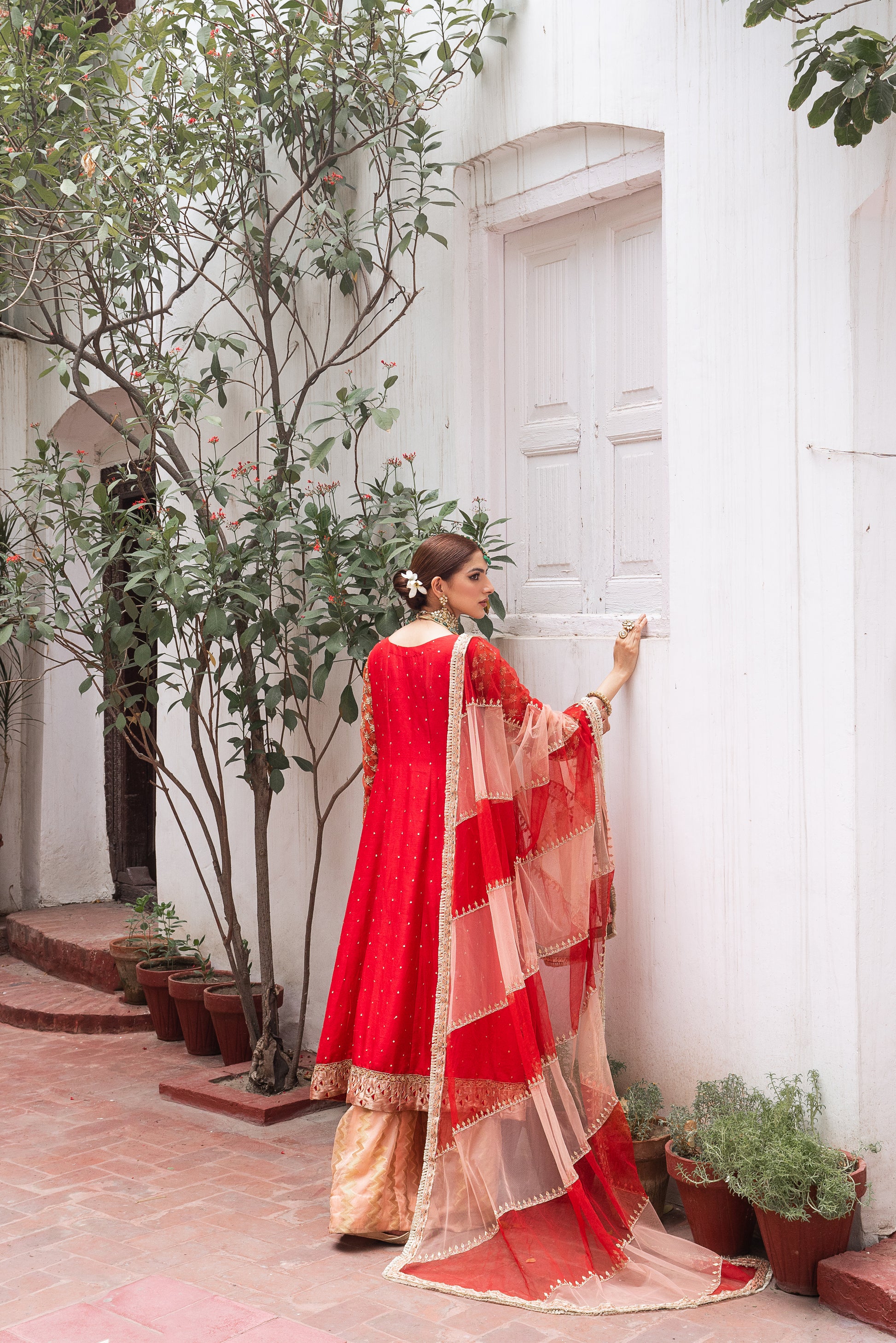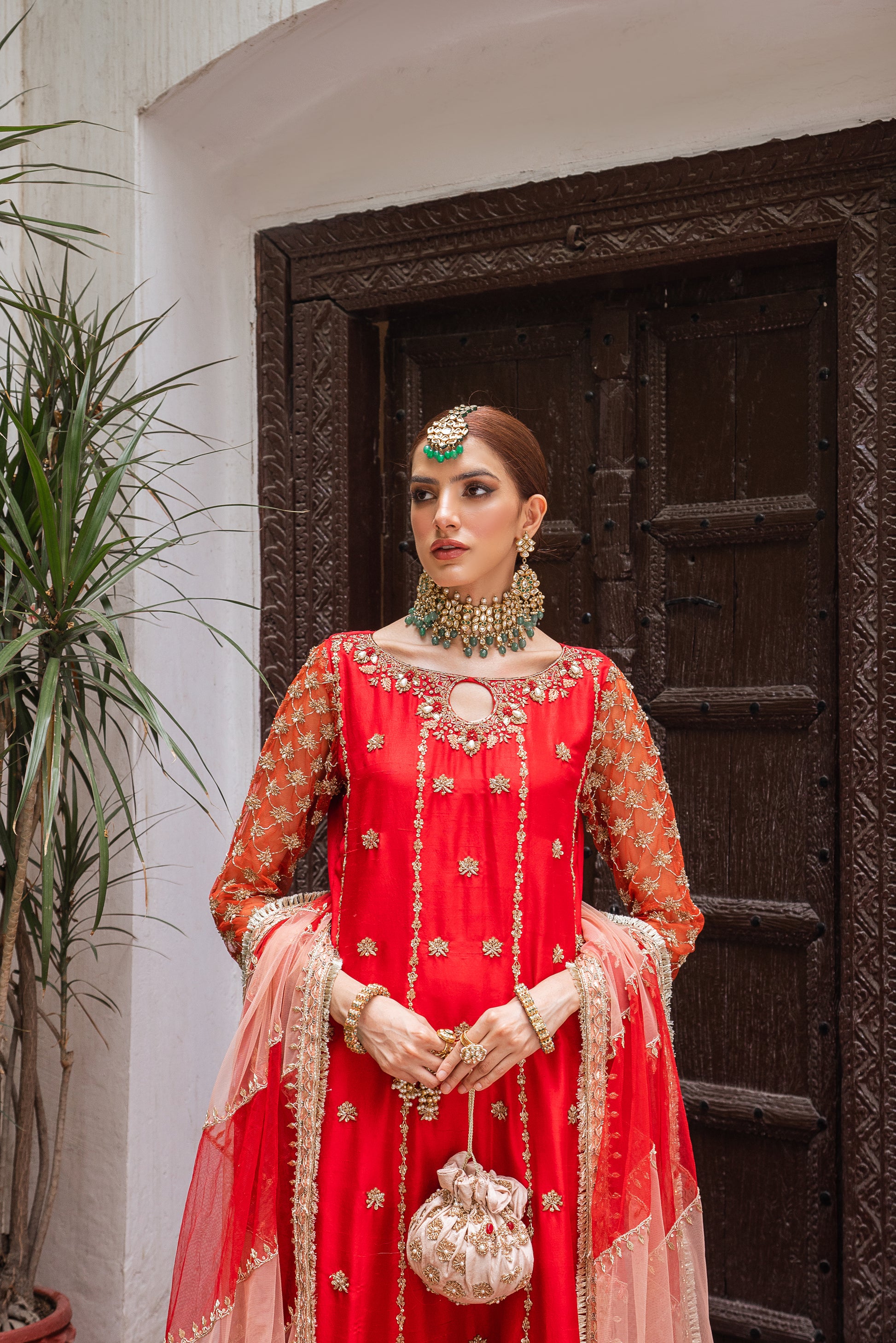 Bahar is a breathtaking coral red paneled kameez, exquisitely hand-embellished with dabka, nakshi, resham in contrasting tones, tilla, sequins, and more. The neckline and borders shimmer with intricate detailing, while the sleeves are adorned with a delicately crafted jaal. Along the length, dabka-encrusted chariyan intertwine with scattered bootis, creating a harmonious play of texture and design. Paired with wide-legged pants in a soft peach contrast and a two-toned net dupatta, framed with four-sided embroidered borders and finished with refined golden fringe. This ensemble captures the essence of timeless elegance with a modern flair.