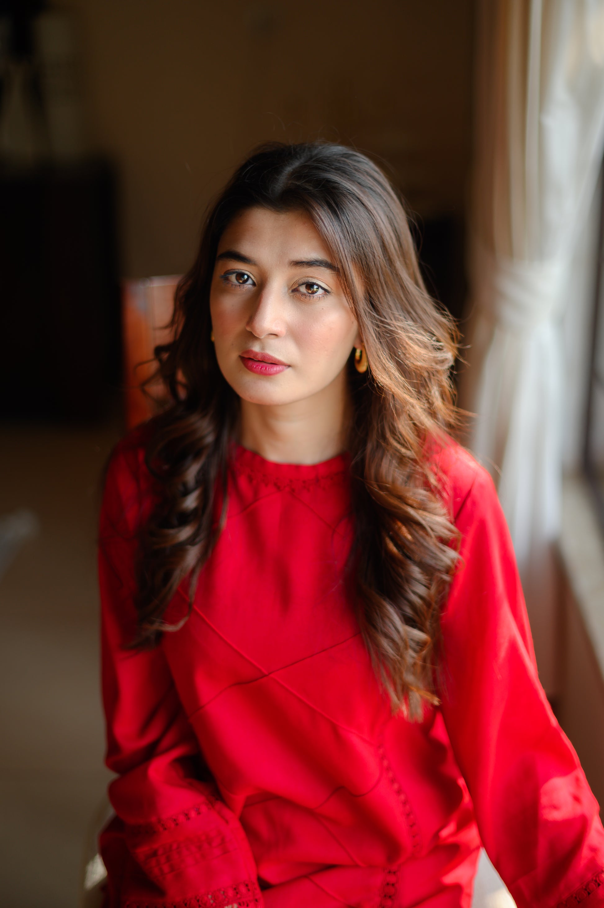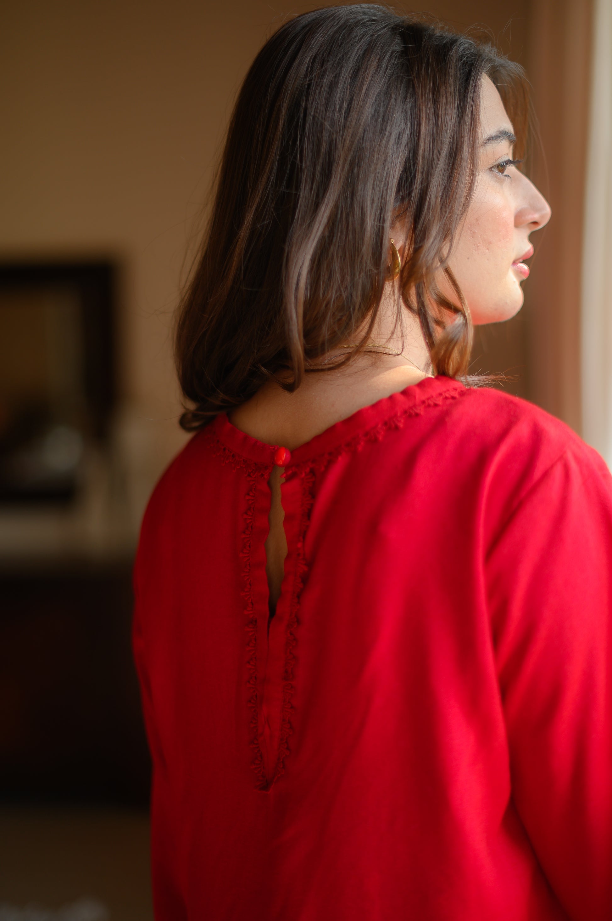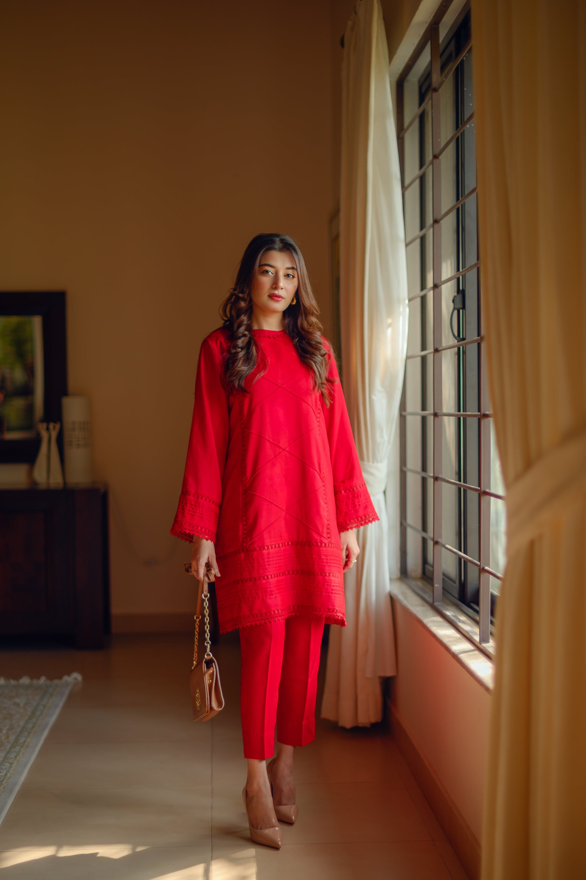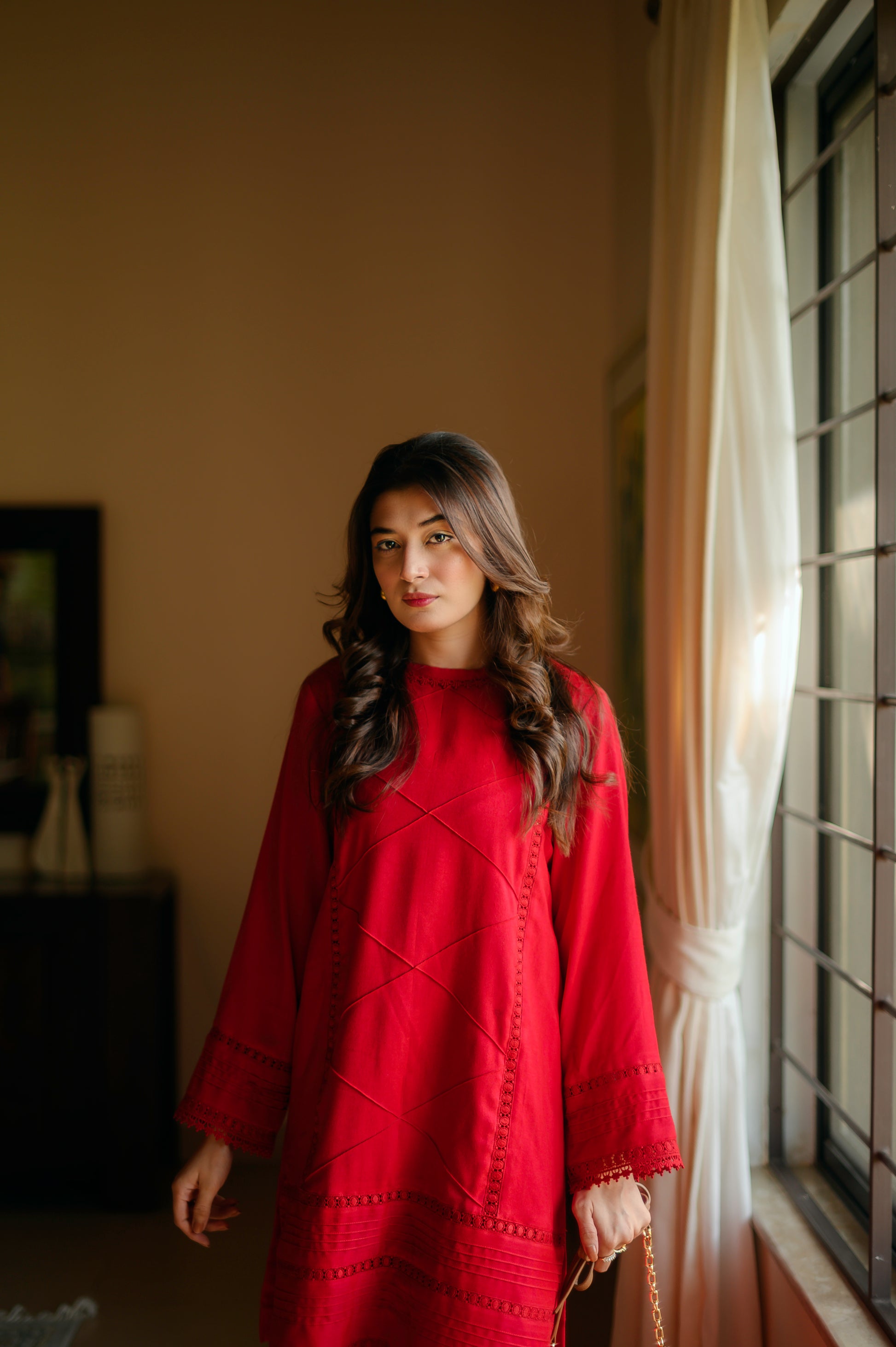 A knee-length straight cut kameez stitched with pleat & lace inlets. It’s paired with slim pants.