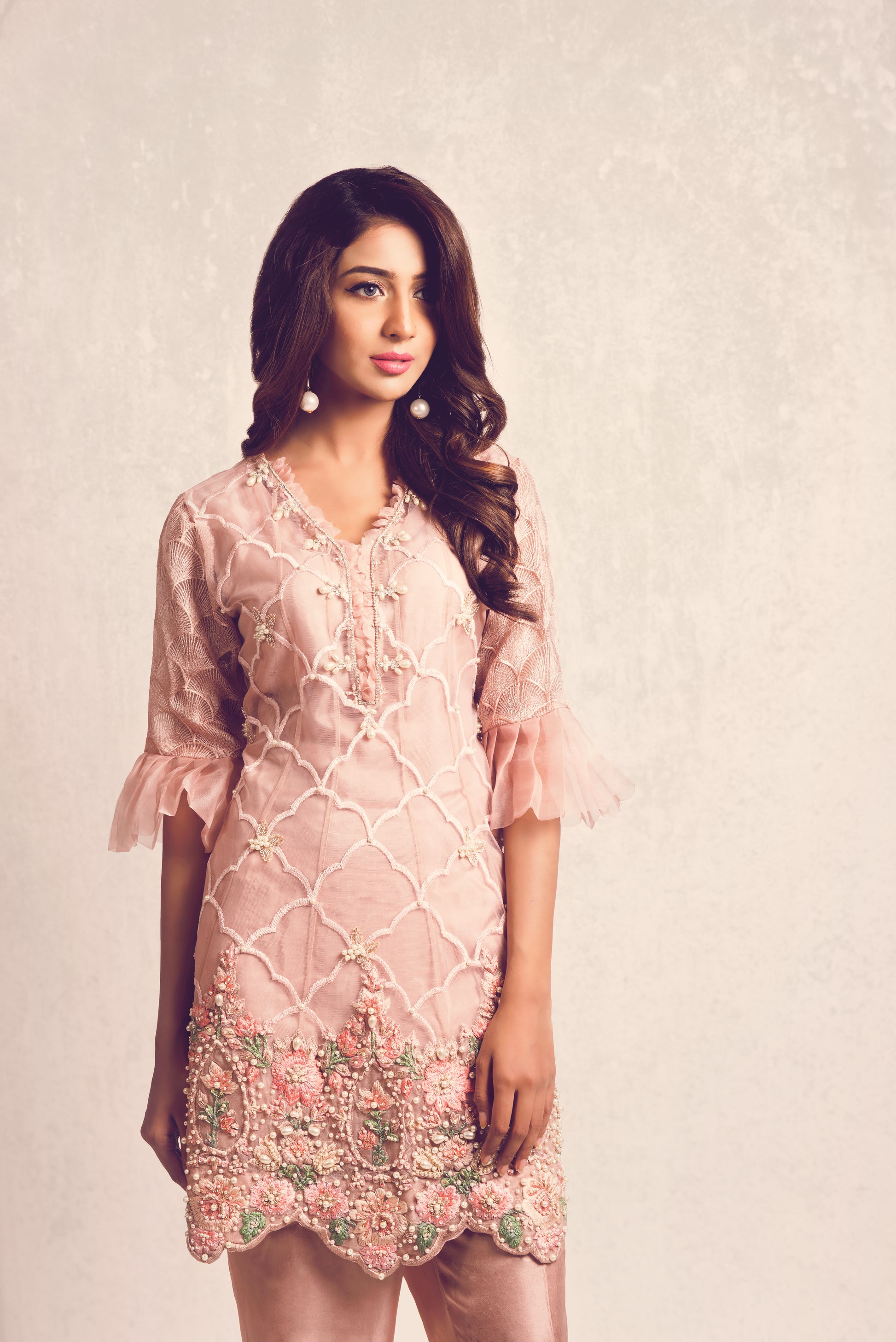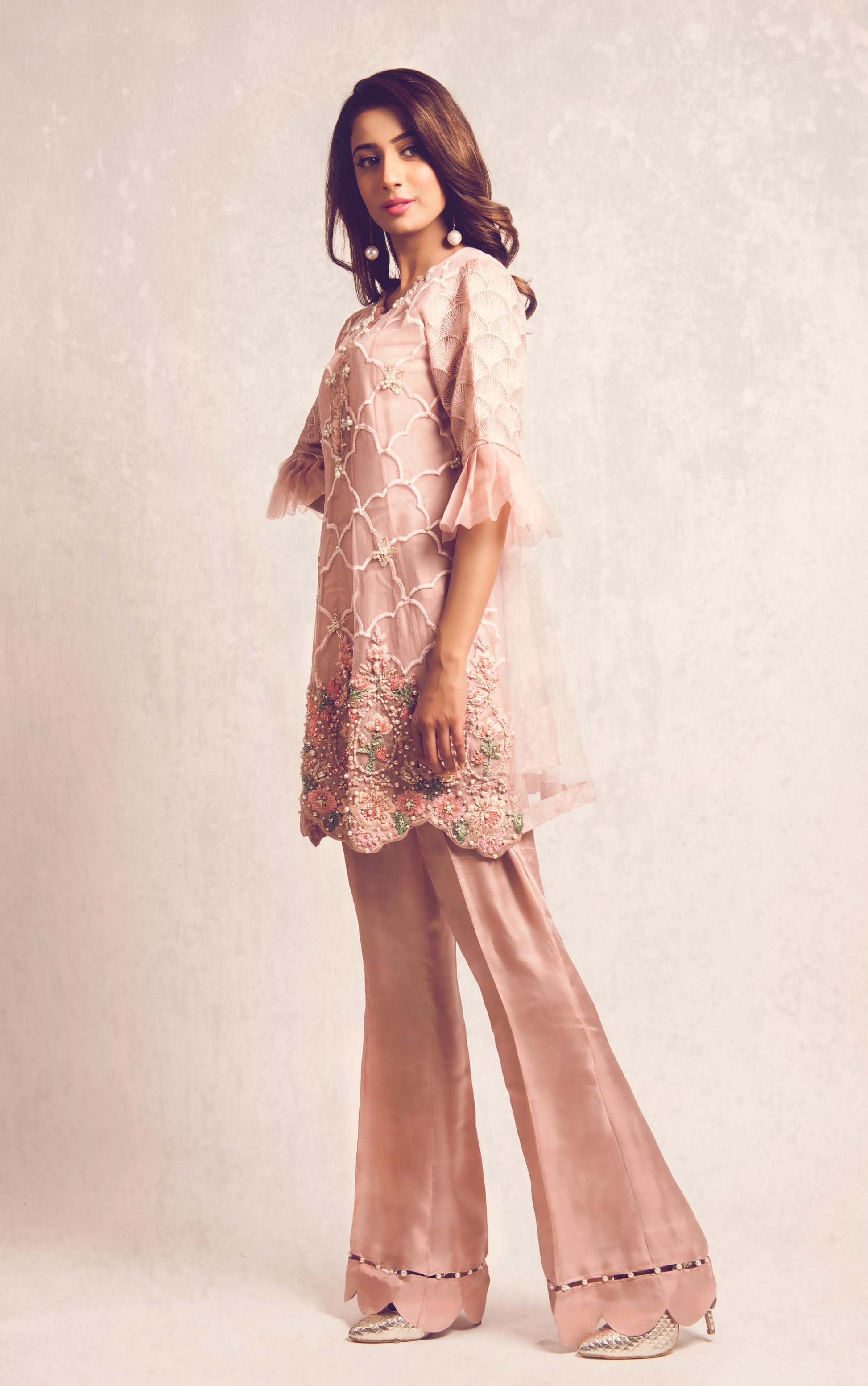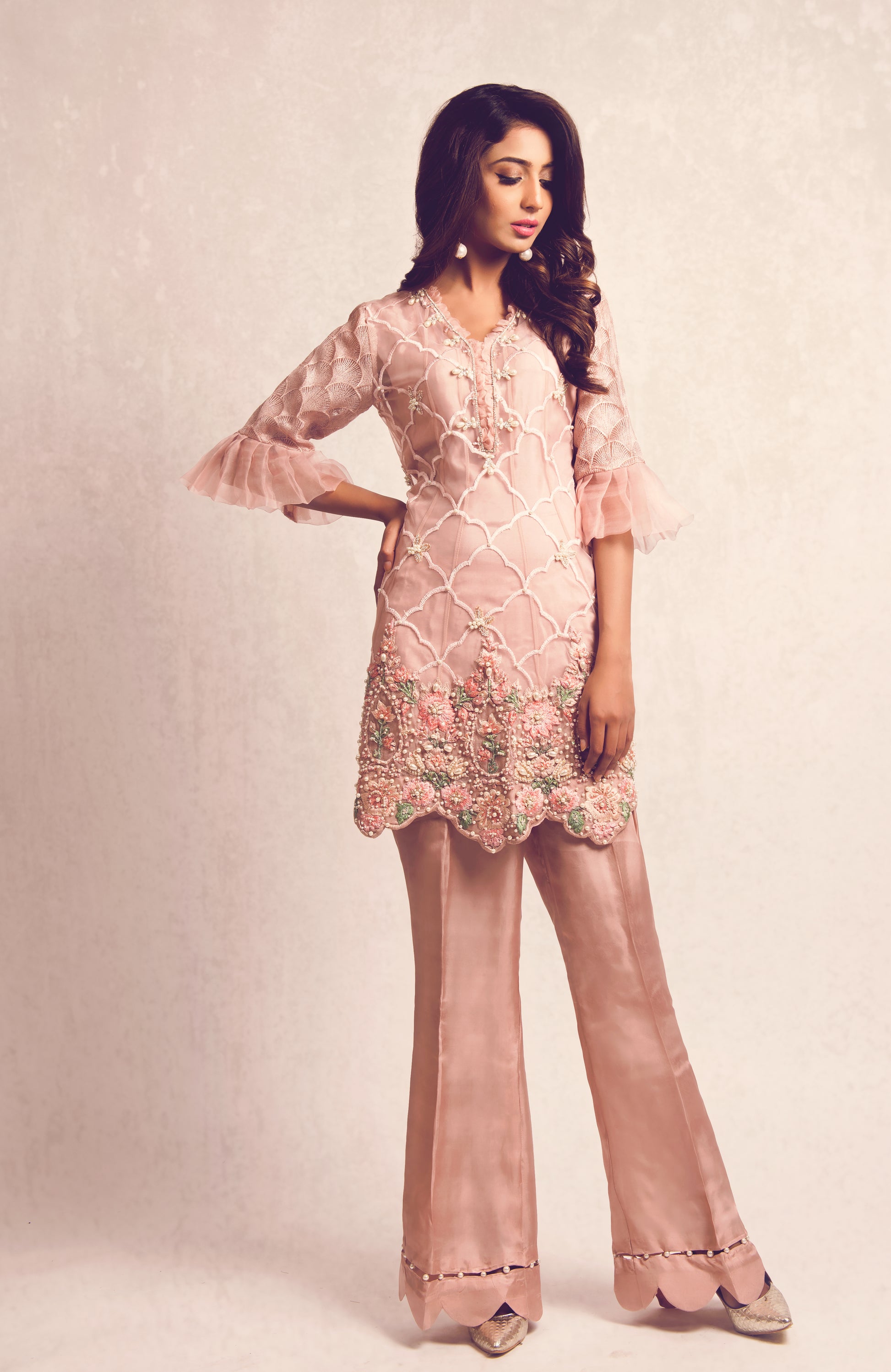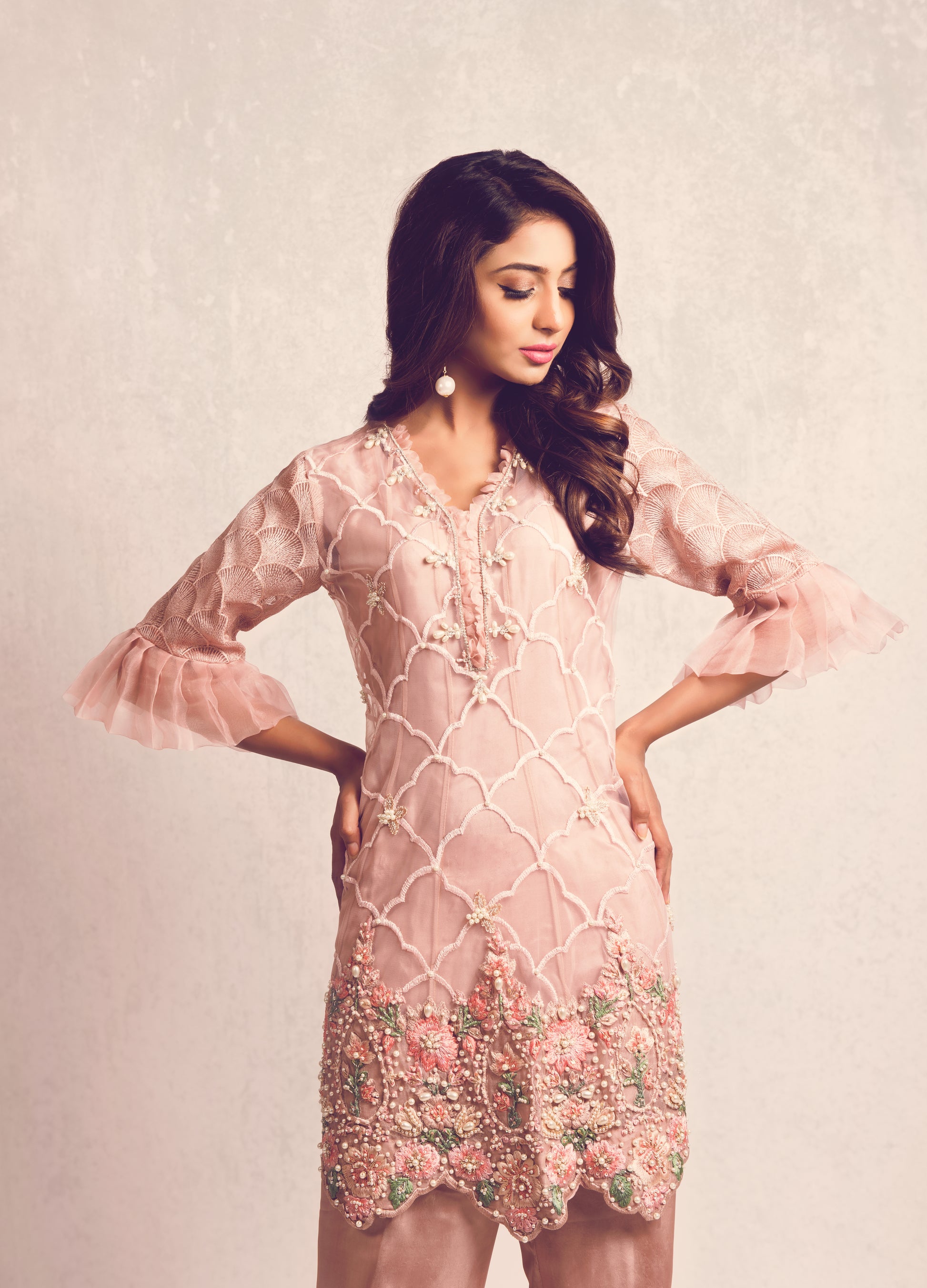 3-4 weeksA chic mid-thigh length shirt in a soft blush pink hue, featuring delicate organza ruffle sleeves. Adorned with intricate floral embroidery in shades of pink, enhanced with exquisite handwork details. Paired with elegant silk bell bottoms for a refined, feminine look.