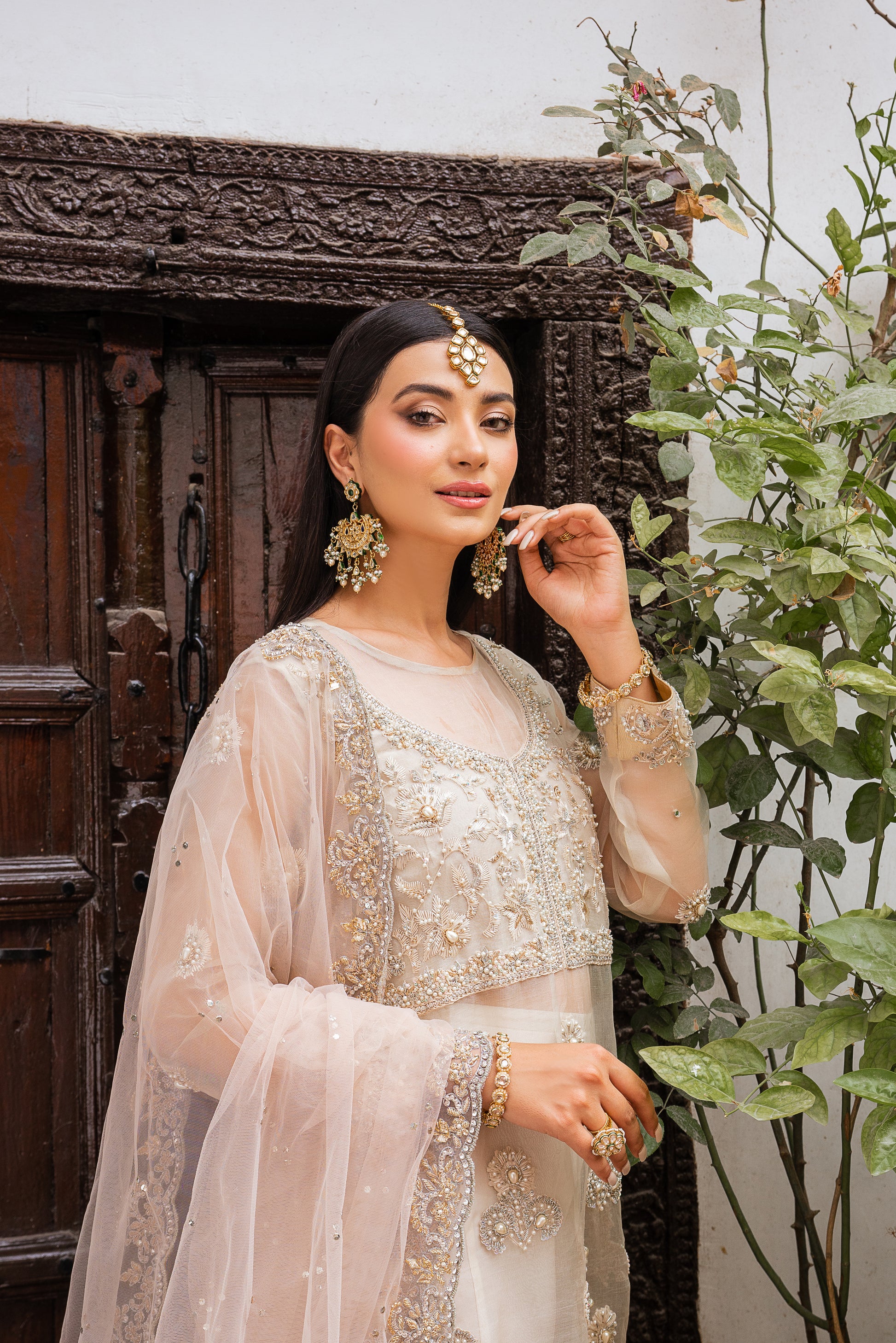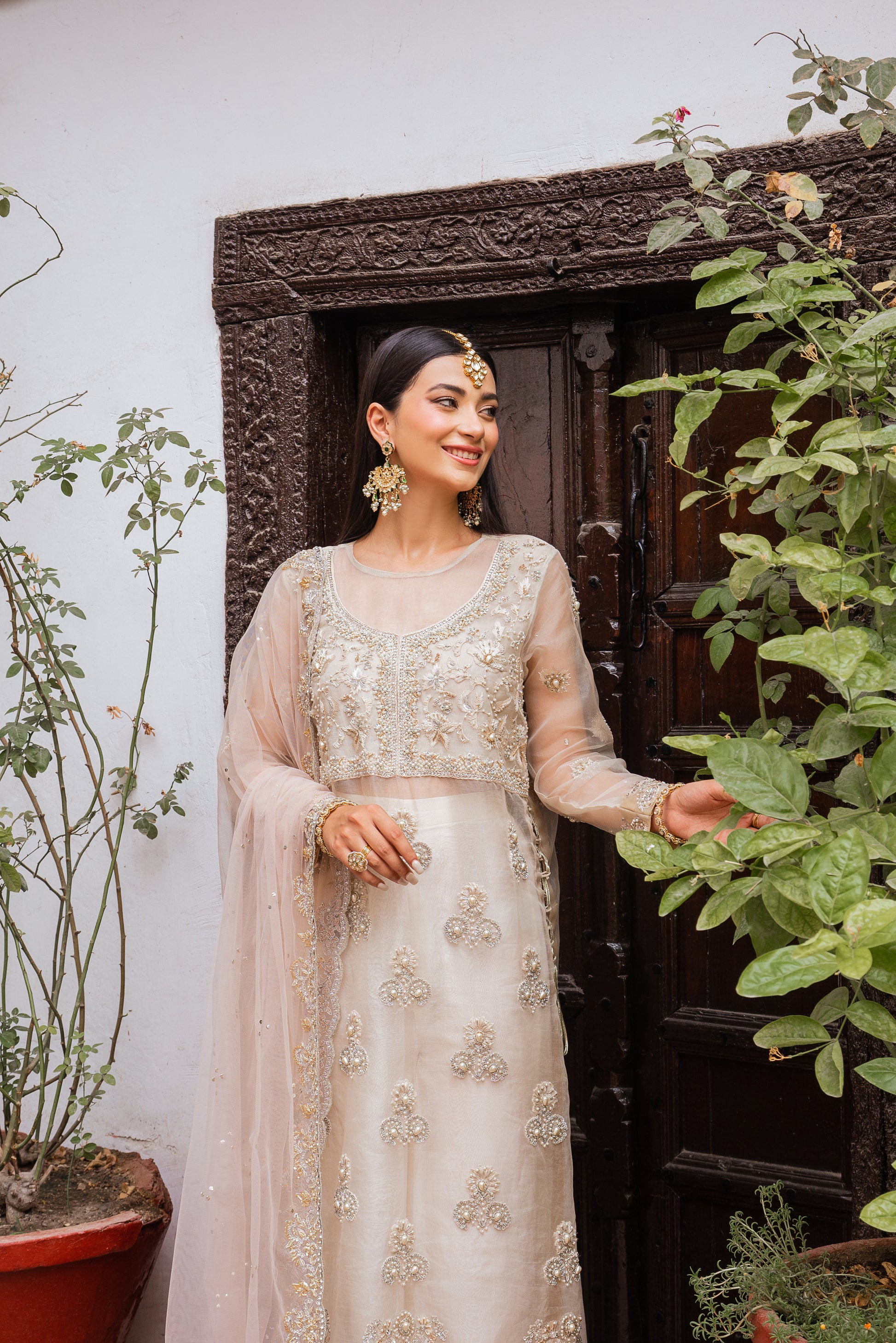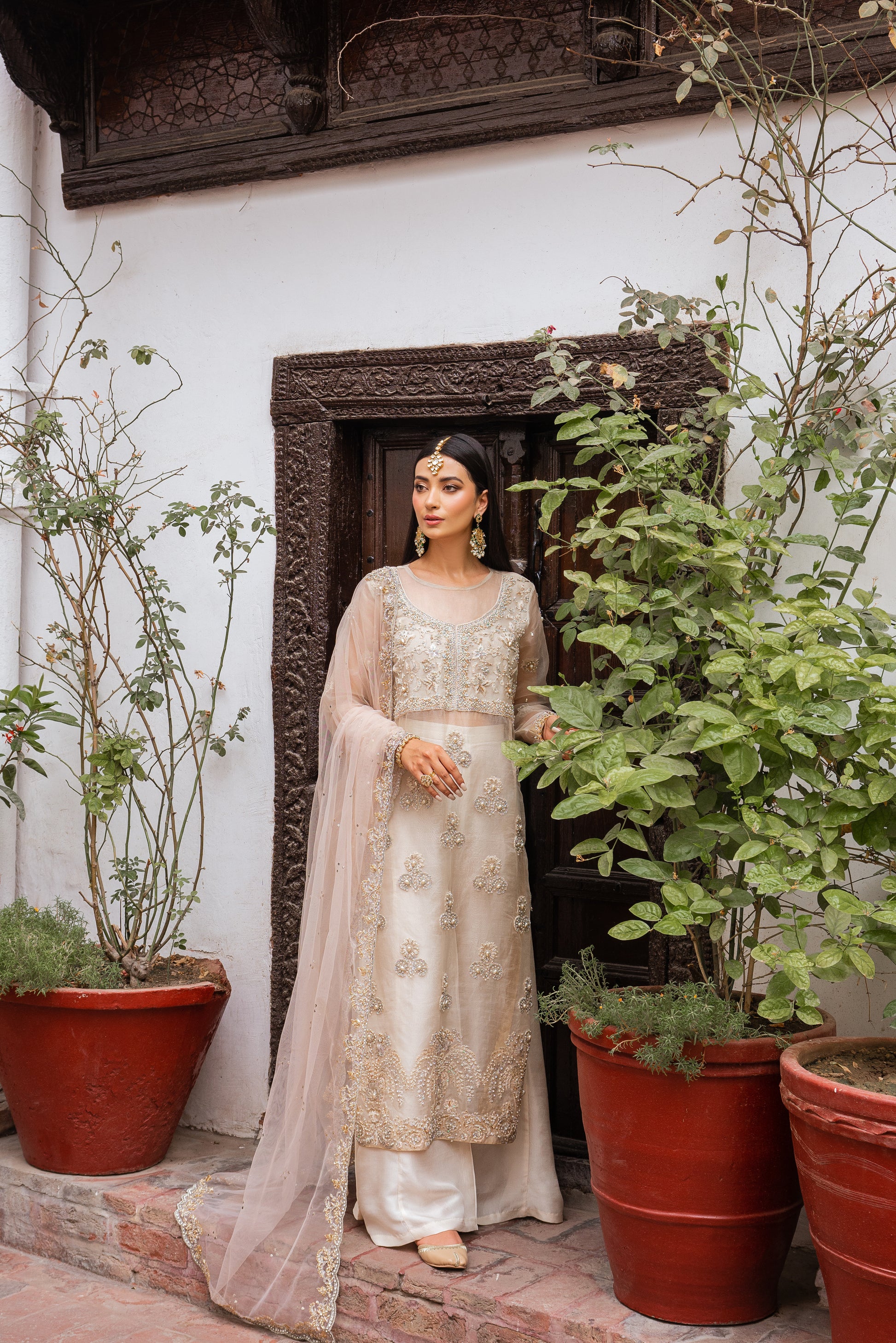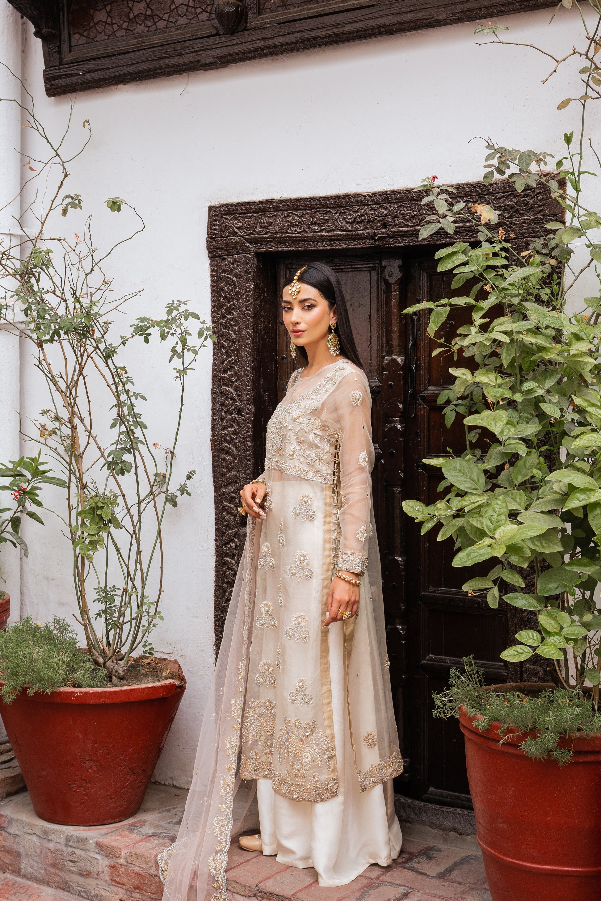 6 WeeksJahan is a timeless long kameez with side slits and dori closures, accentuated with playful tassels. The bodice, sleeves, and borders are delicately embroidered in tonal threadwork, further elevated with hand-sewn dabka, sheesha, fabric stripes, and 3D sequins on a textured base. Floral bouquets bloom along the borders and cascade across the kameez, meticulously crafted through a blend of artisanal techniques and materials. Paired with wide-legged, flowy silk pants, this ensemble embodies refined elegance with a touch of modern ease.