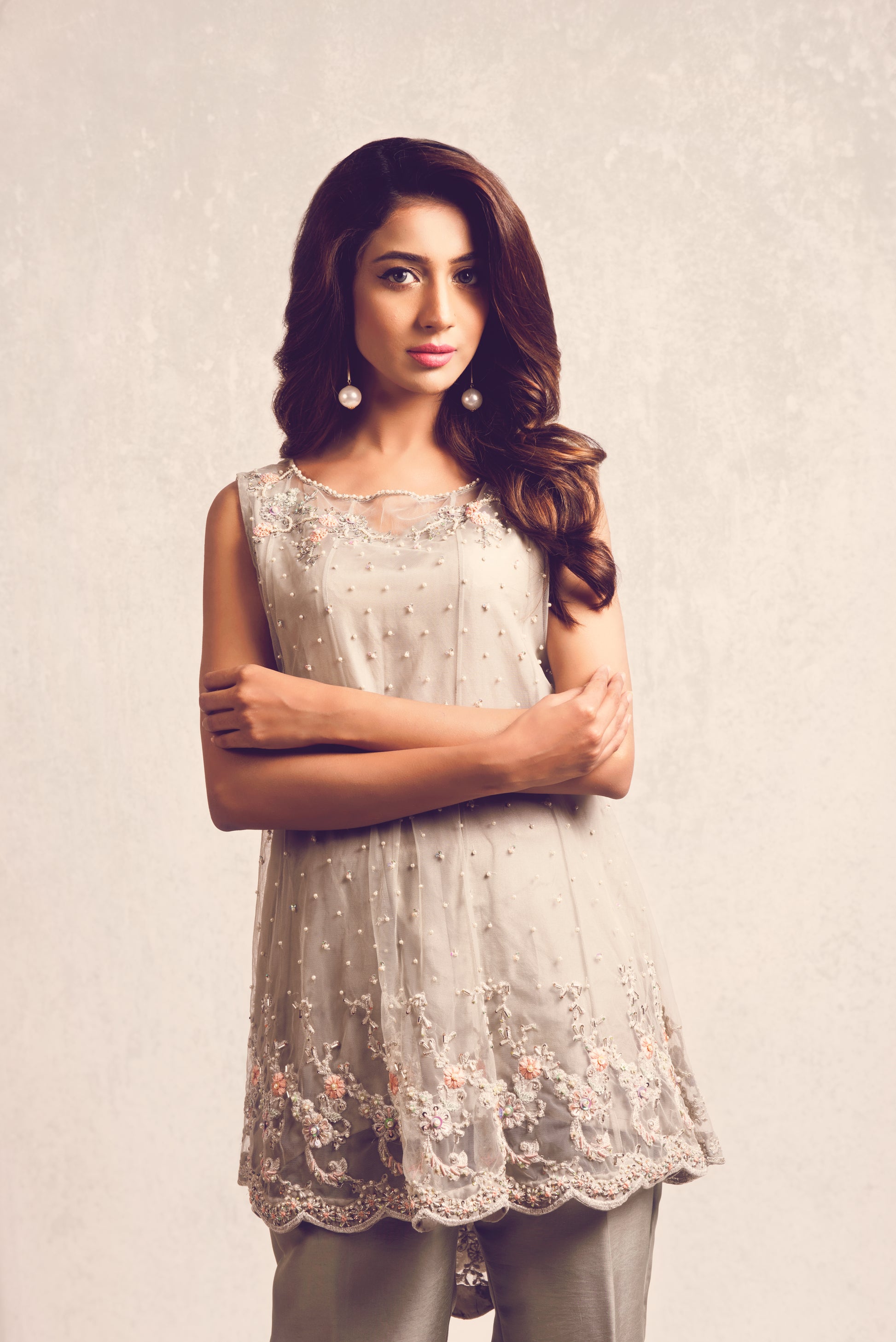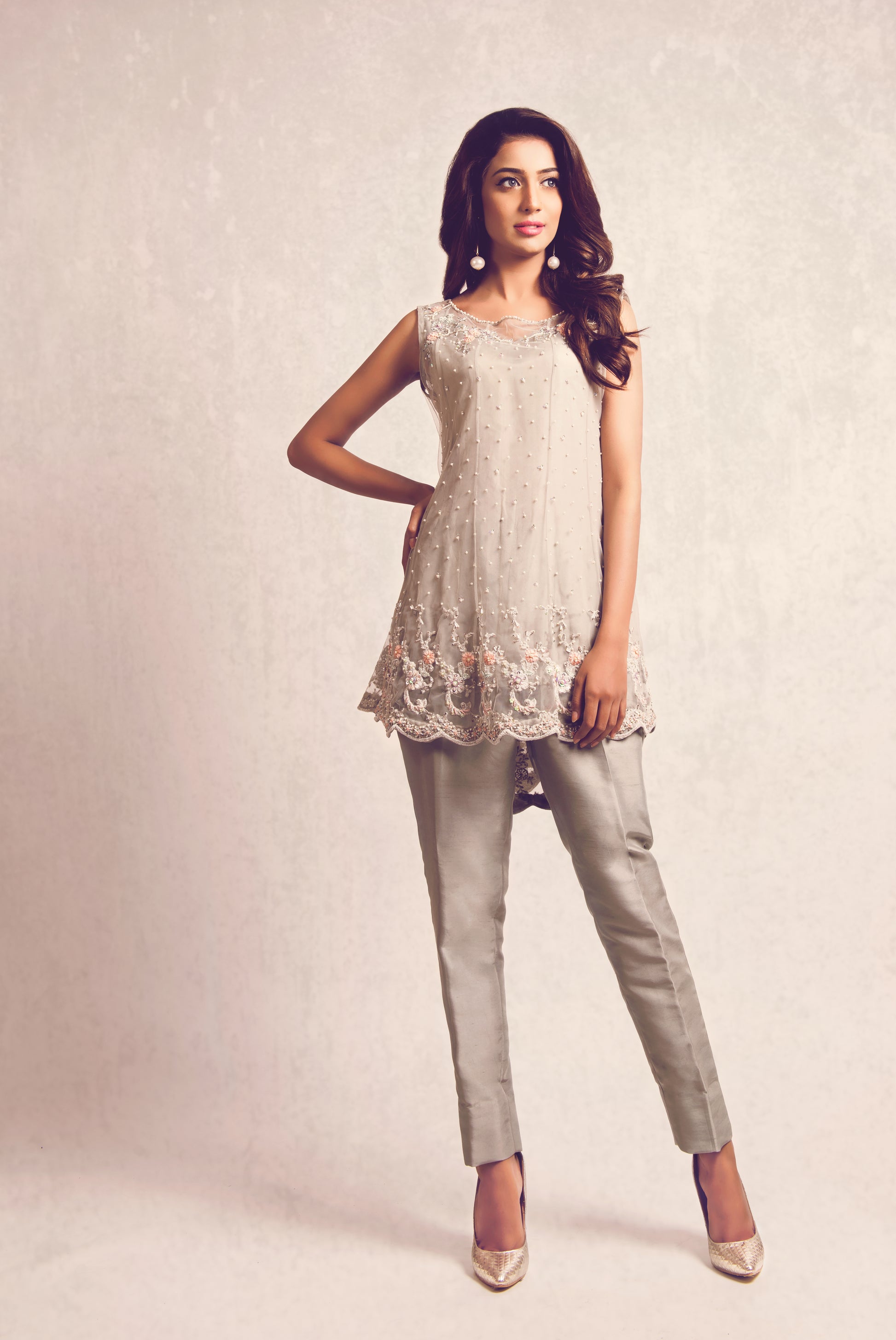 3-4 weeksAn elegant mid-thigh length paneled dress crafted from ash grey net, featuring a gracefully lowered back. Delicate pearl and crystal embellishments shimmer alongside intricate thread embroidery in soft hues of peach and mint, creating a timeless blend of elegance and charm. Paired with sleek slim pants for a refined silhouette.