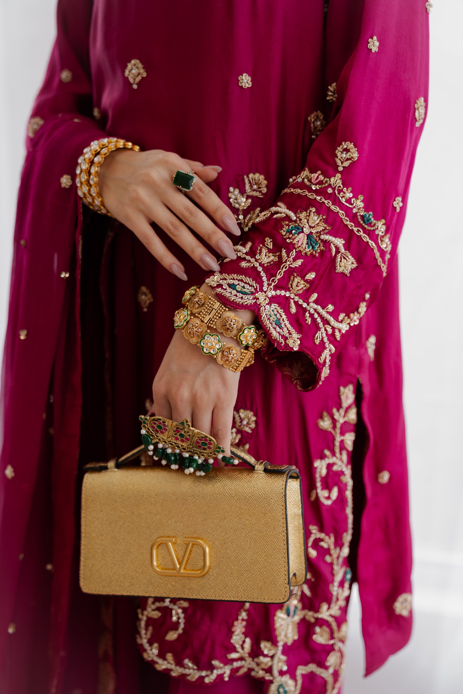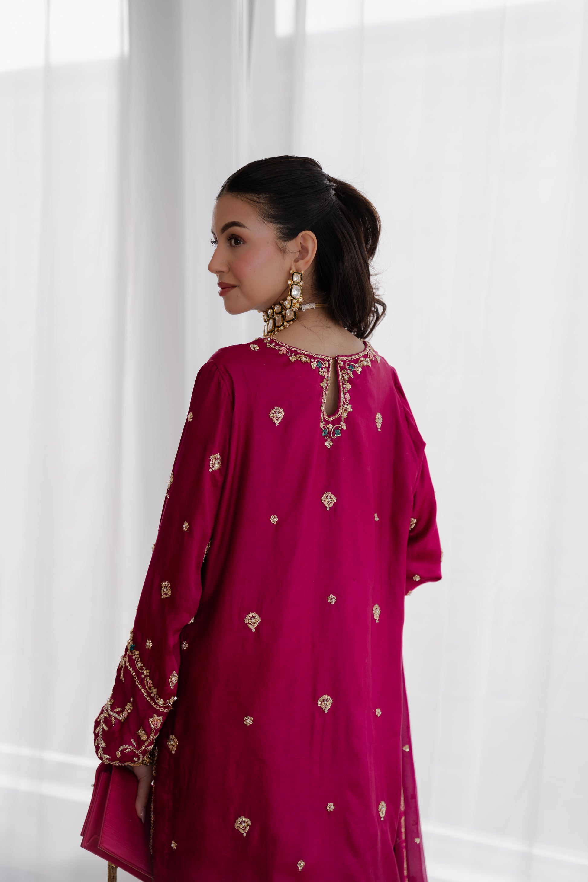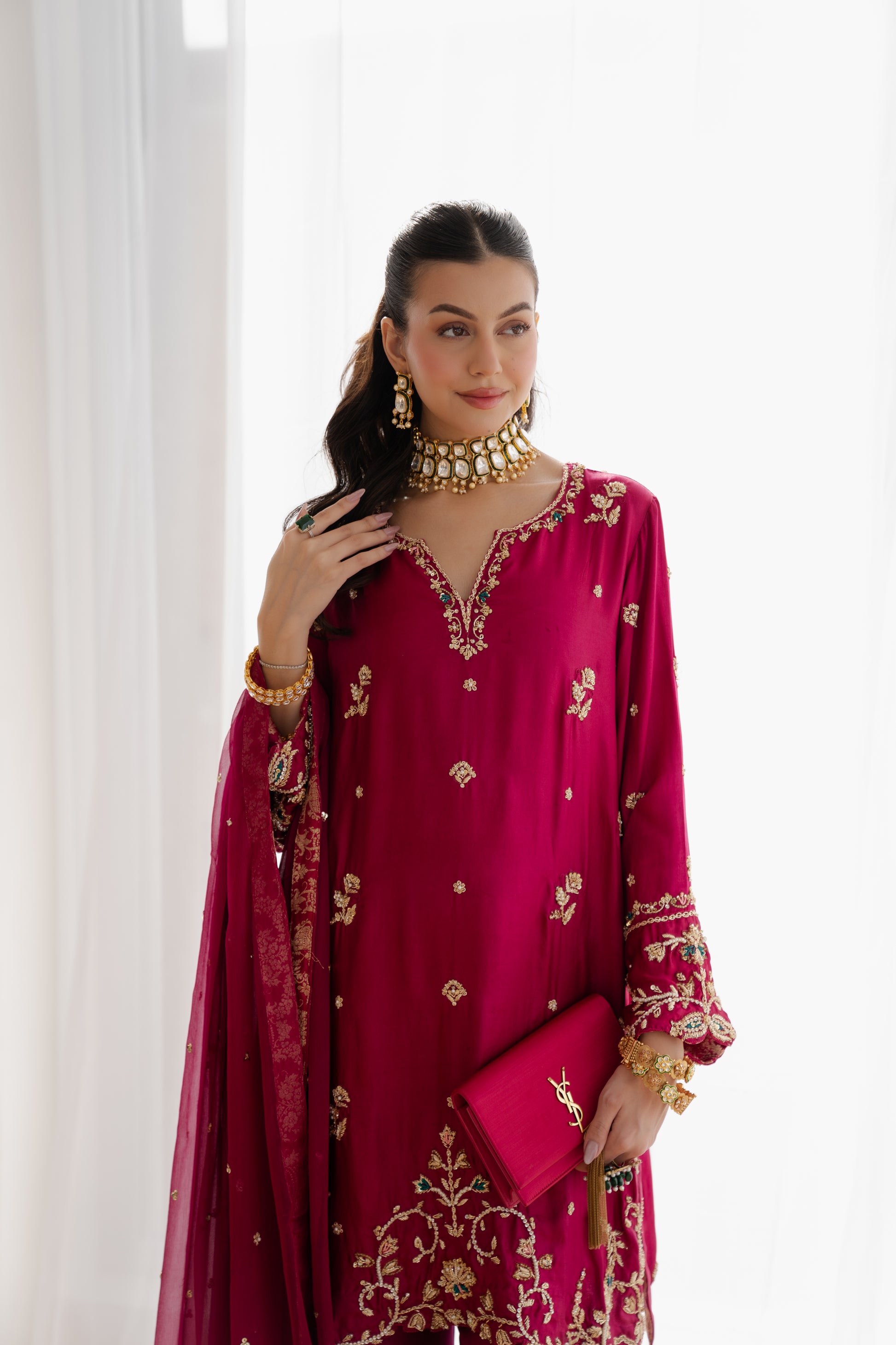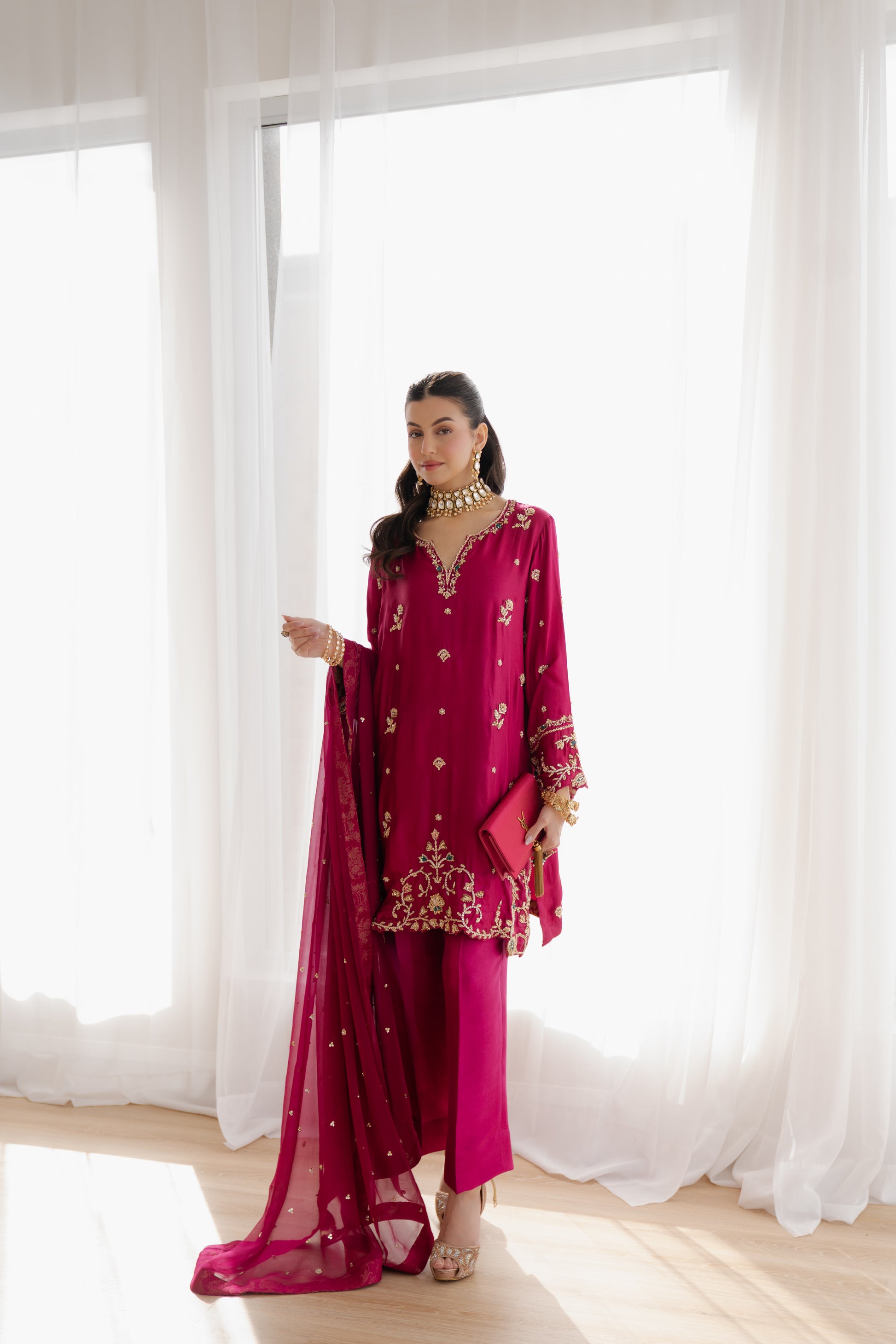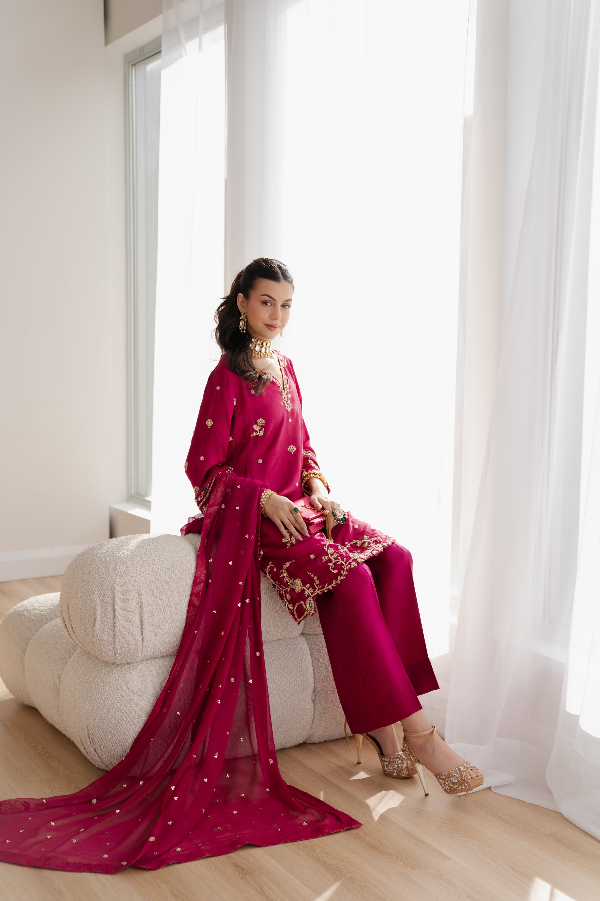 A pure silk box-cut kameez in a vibrant magenta hue, featuring intricate hand embellishments and subtle thread detailing. Paired with a pure chiffon dupatta adorned with scattered sequins and a banarsi finish, styled with straight-cut raw silk pants for a refined, elegant look.