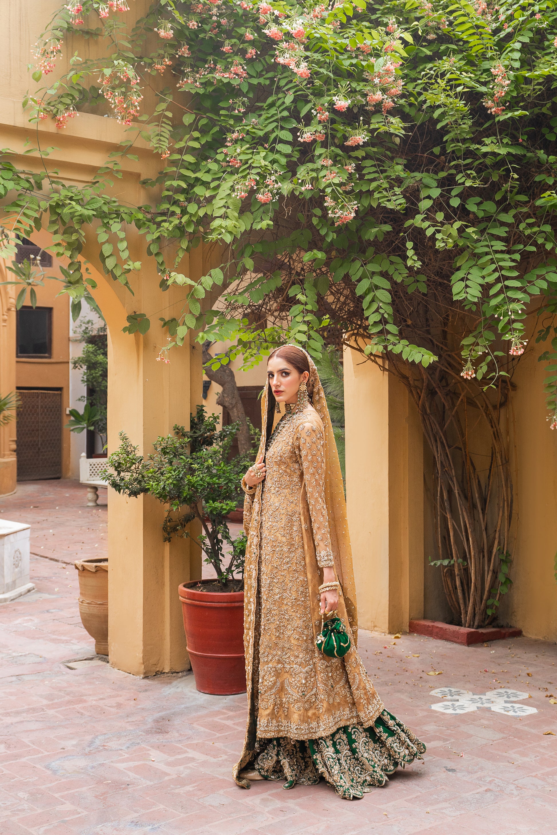 12 weeksA mesmerizing deep golden zari kalidar, meticulously handcrafted with intricate techniques and opulent embellishments, sets the tone for this regal ensemble. It is paired with a deep green pure silk lehenga, lavishly adorned with exquisite dabka and zardozi artistry. A pure zari net dupatta, framed with a richly embellished four-sided border, completes the look, radiating royal grandeur and timeless appeal.